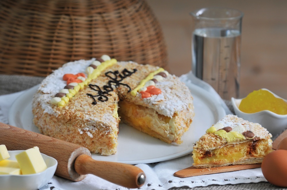 Pasta sfoglia con strato di pandispagna, crema pasticcera e decorazioni a scelta |